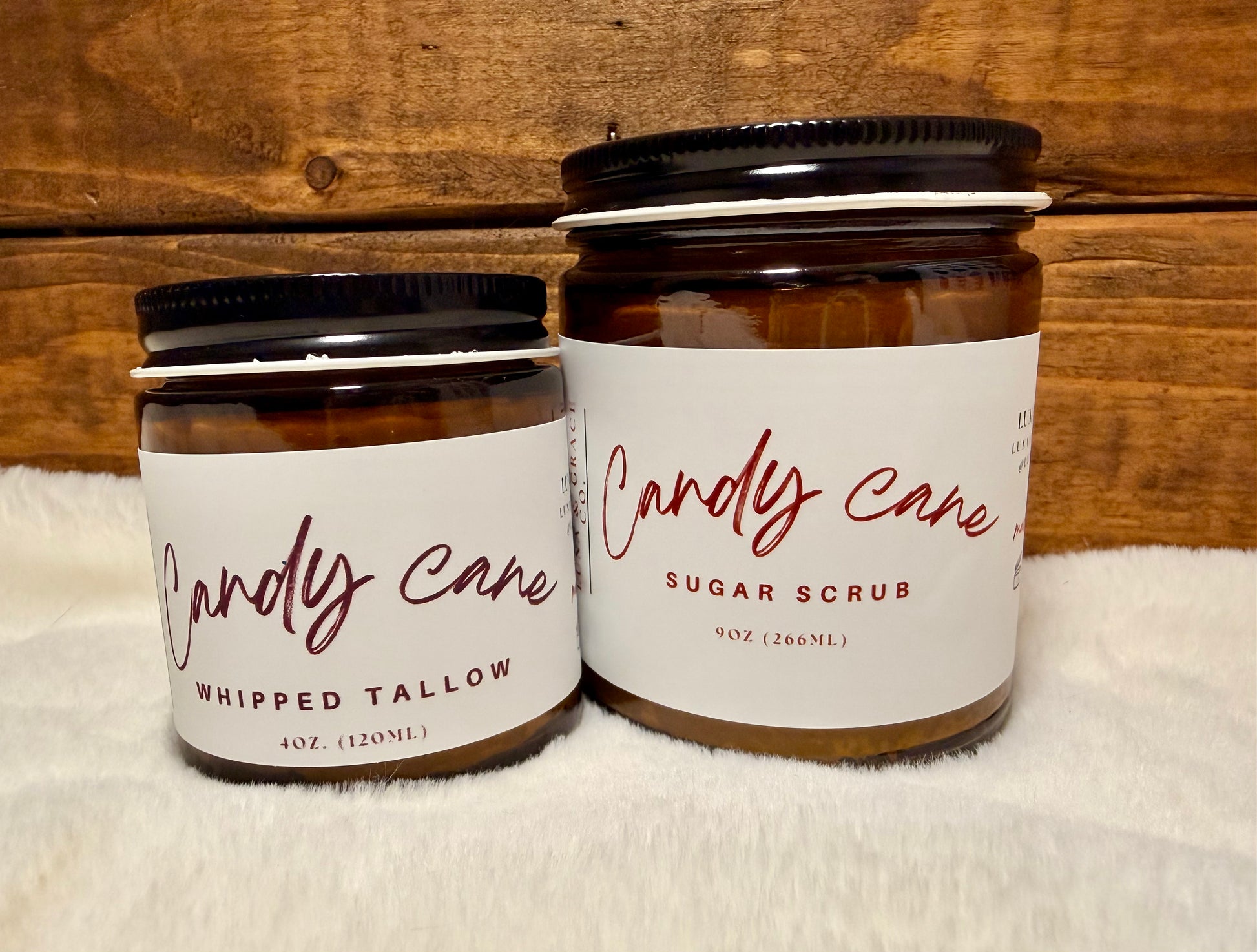 - Candy Cane Sugar Scrub — made with grass-fed & finished tallow, organic coconut oil, organic cane sugar, organic jojoba oil, organic Madagascar vanilla beans, and peppermint essential oil.