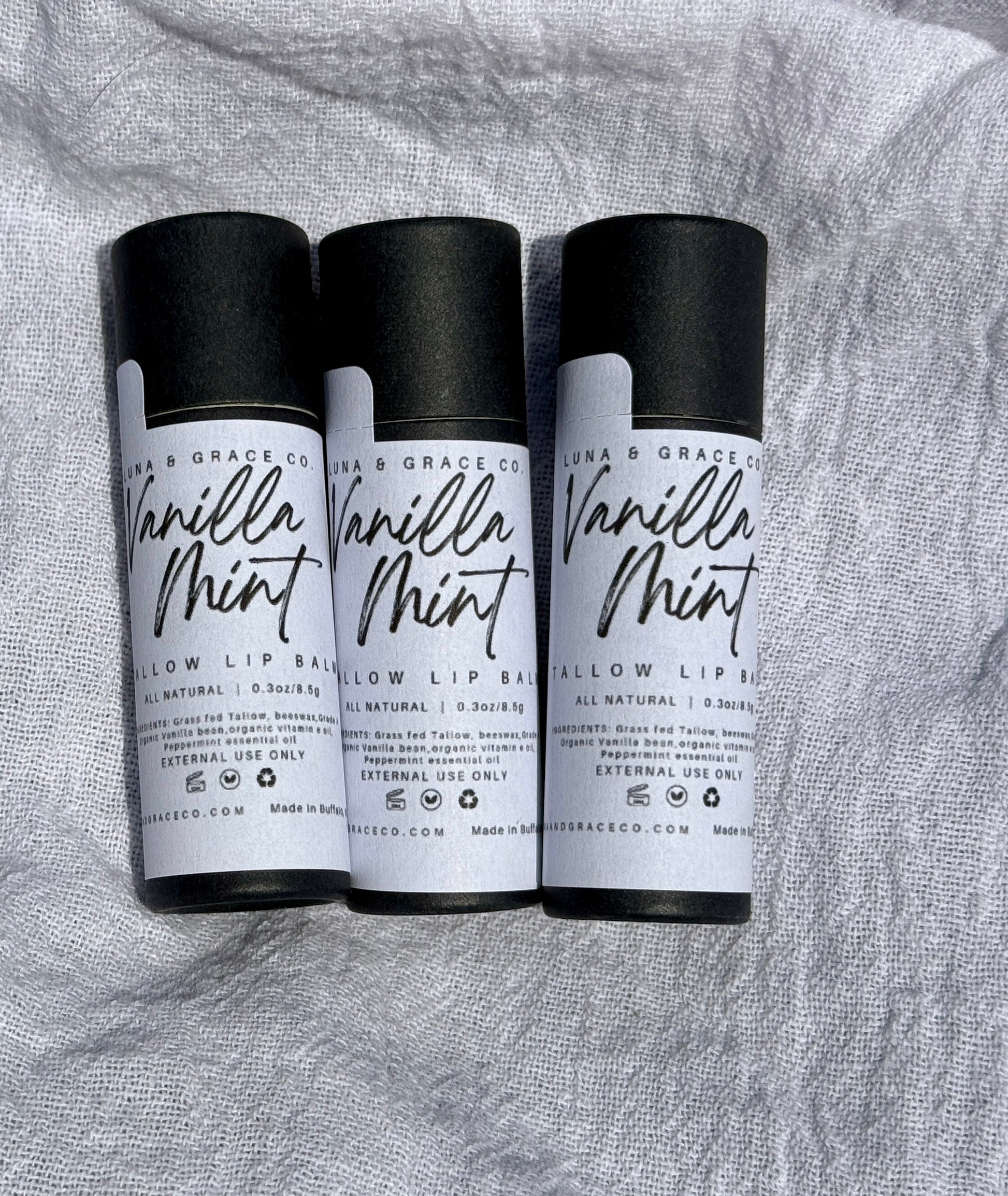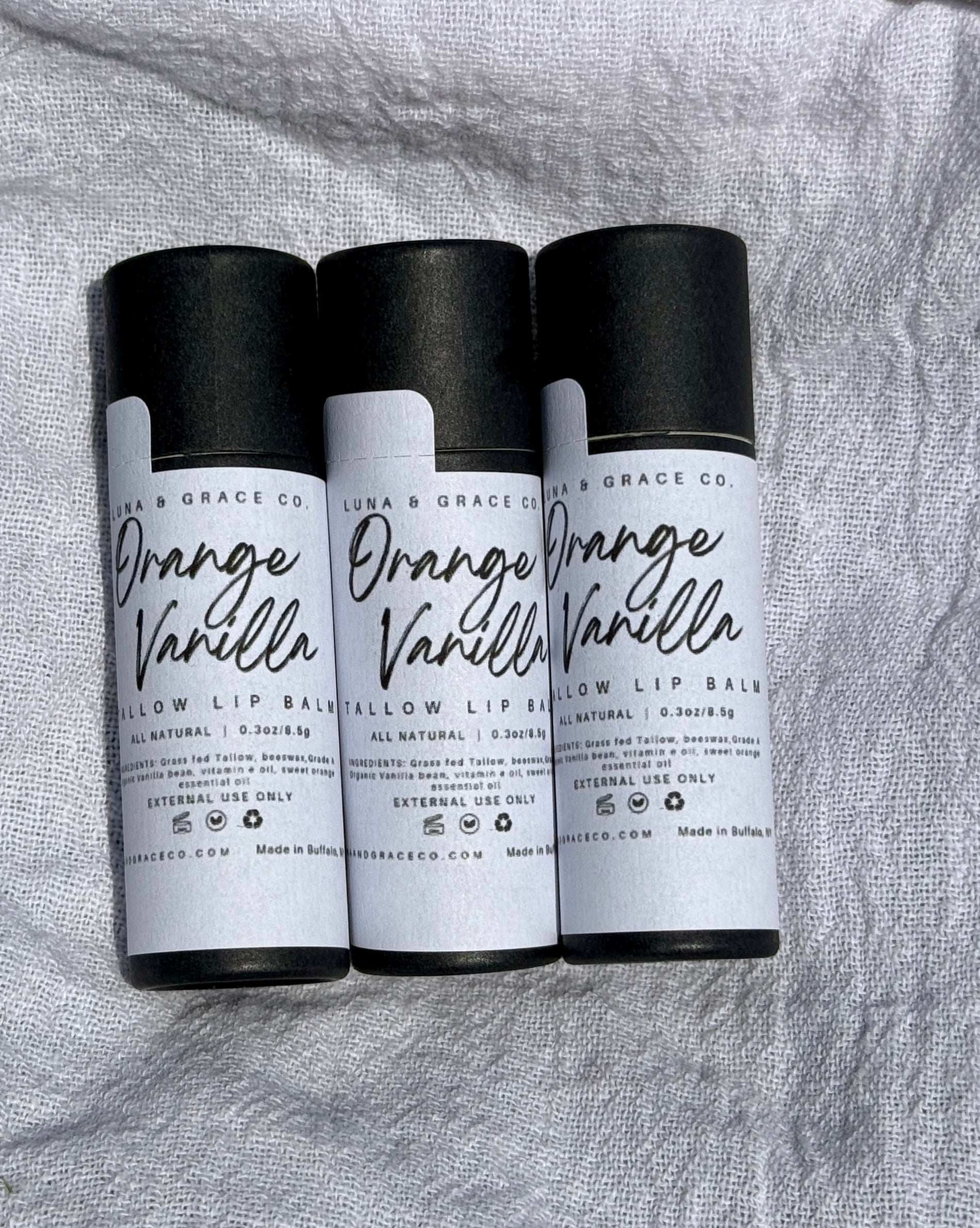 Ingredients: 100% Grass fed beef tallow, organic beeswax, organic Vitamin E, Organic Madagascar Vanilla Beans (if vanilla scented) and Organic Essential oils